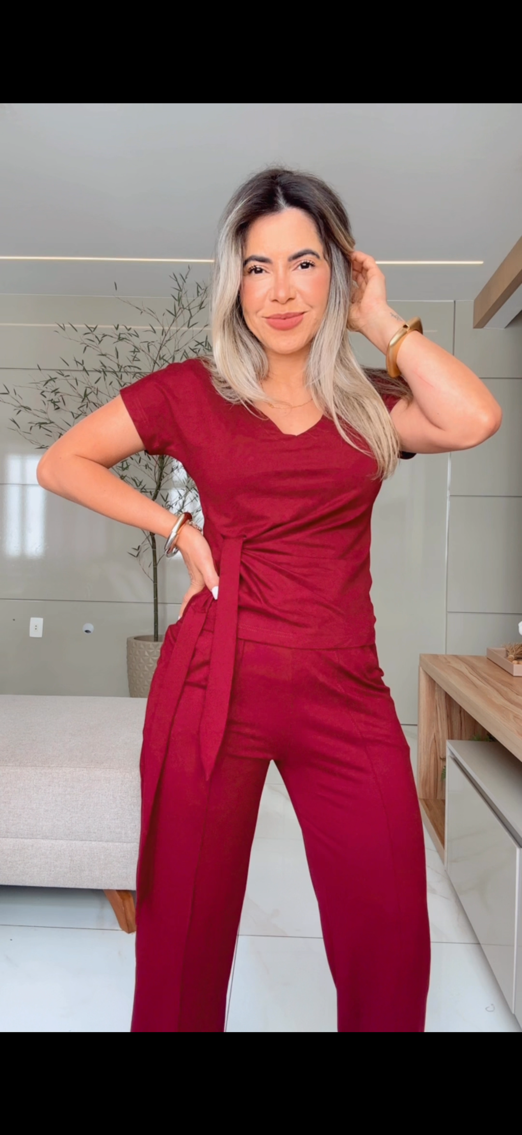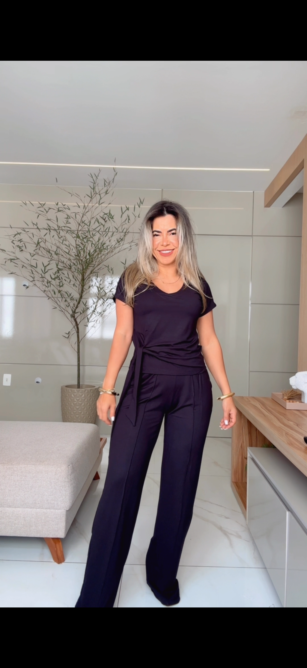 CONJUNTO DE MALHA, DECOTE V E COM AMARRAÇÃO LATERAL.